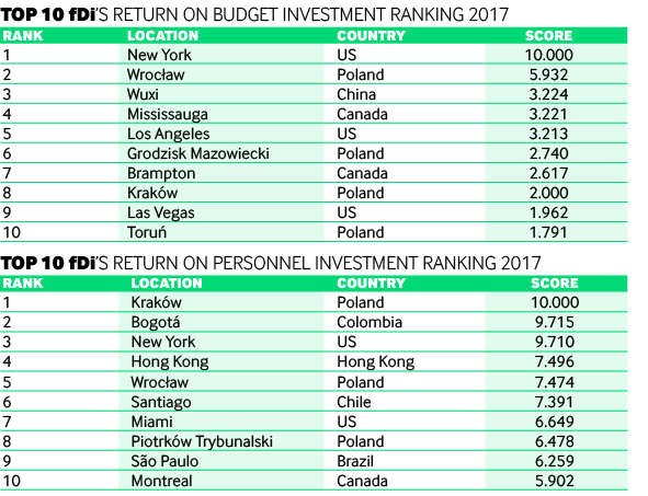 First place in fDi's return on investment ranking goes to New York City Economic Development Corporation, with Wrocław Agglomeration Development Agency in second, and the City of Kraków top for personnel investment.